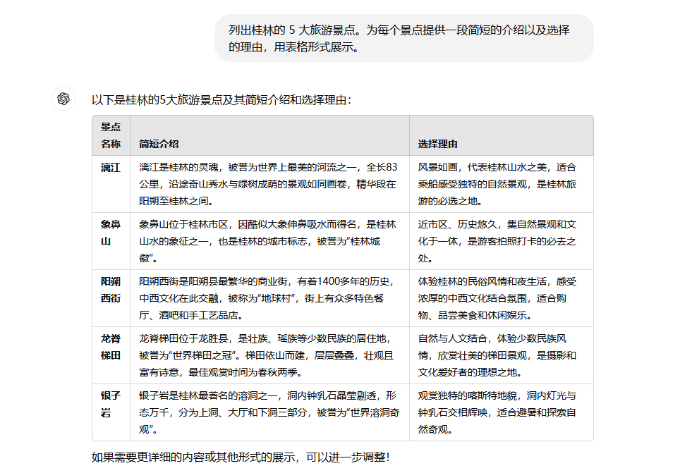 例如:“列出桂林的 5 大旅游景点。为每个景点提供一段简短的介绍以及选择的理由,用表格形式展示。”