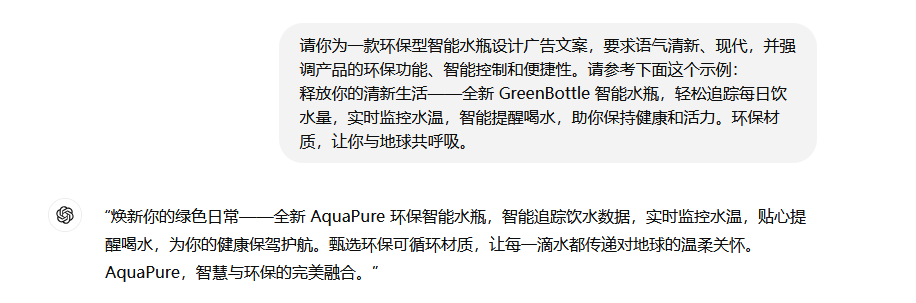 例如:“请你为一款环保型智能水瓶设计广告文案,要求语气清新、现代,并强调产品的环保功能、智能控制和便捷性。请参考下面这个示例: