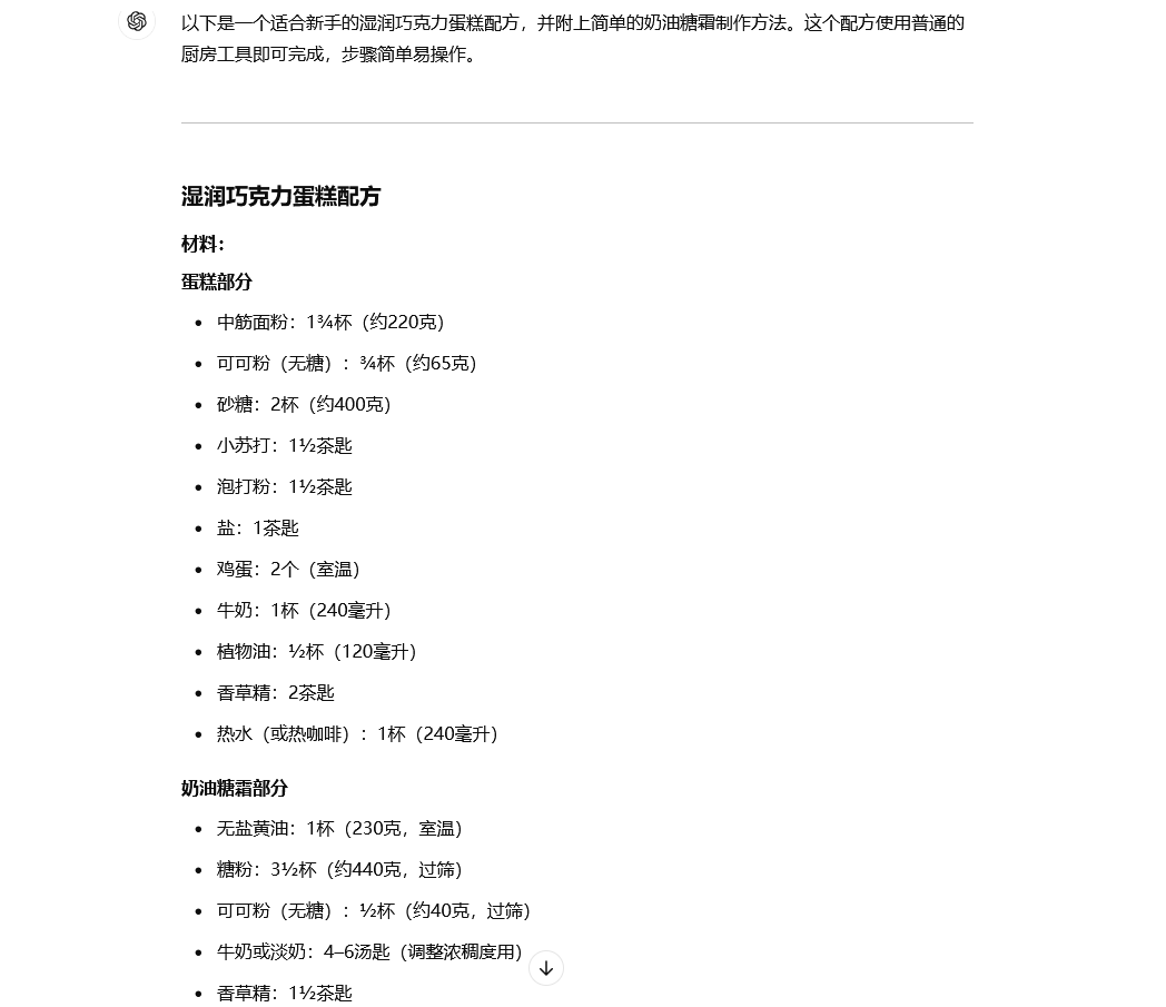 例如,不要简单问“如何制作巧克力蛋糕?”,这样 AI 很可能会给出笼统的答案。你可以改成:“能不能提供一份适合新手的巧克力蛋糕配方?要求蛋糕湿润,还要有奶油糖霜,能用普通家用厨房工具完成。”