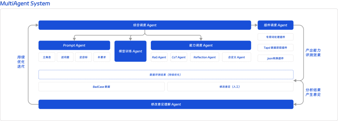 - 意见理解Agent:负责理解评测结果,根据BadCase和认为修改意见给出修改建议,提供给综合调度Agent,进行持续的优化迭代。