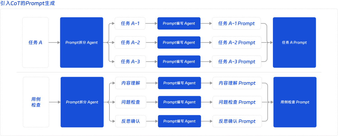 我们应用这种思想,首先对任务的思维链进行拆分,将任务拆分为多个推理环节,并针对各个推理环节生成prompt,以此提升模型在任务中整体的应用效果,同时提升模型的稳定性和可控性。