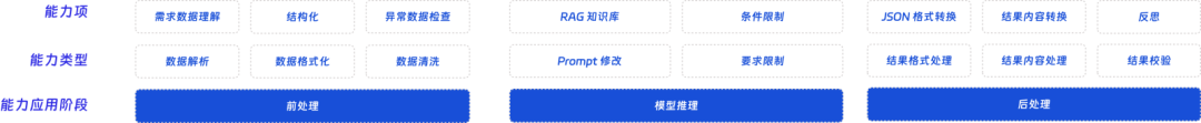 - 后处理阶段:对模型的输出结果进行处理,在格式和内容上贴合应用的需求,并进一步提升输出结果的稳定性,包含的能力类型有: