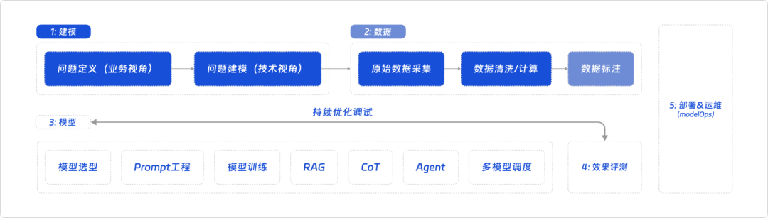 结合我在模型应用研发上的探索,目前的模型应用研发工作可以大致分为如下几个环节: