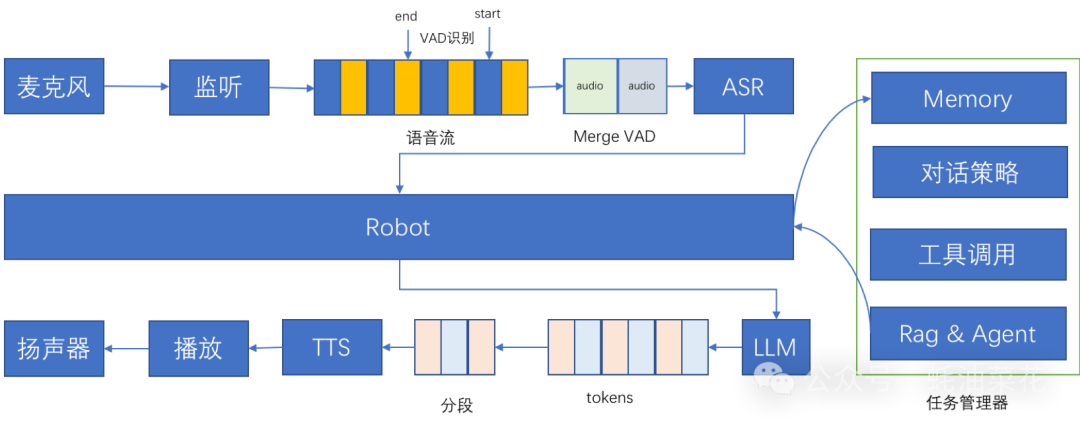 • 语音识别(ASR):基于FunASR技术,将语音信号转换为文本数据,涉及语音信号的采集、预处理、特征提取及模式匹配。