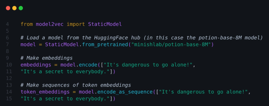 开始使用 Model2Vec 的最简单方法是从 HuggingFace 中心加载其旗舰模型之一。这些模型经过预先训练并可立即使用。以下代码片段展示了如何加载模型并进行嵌入: