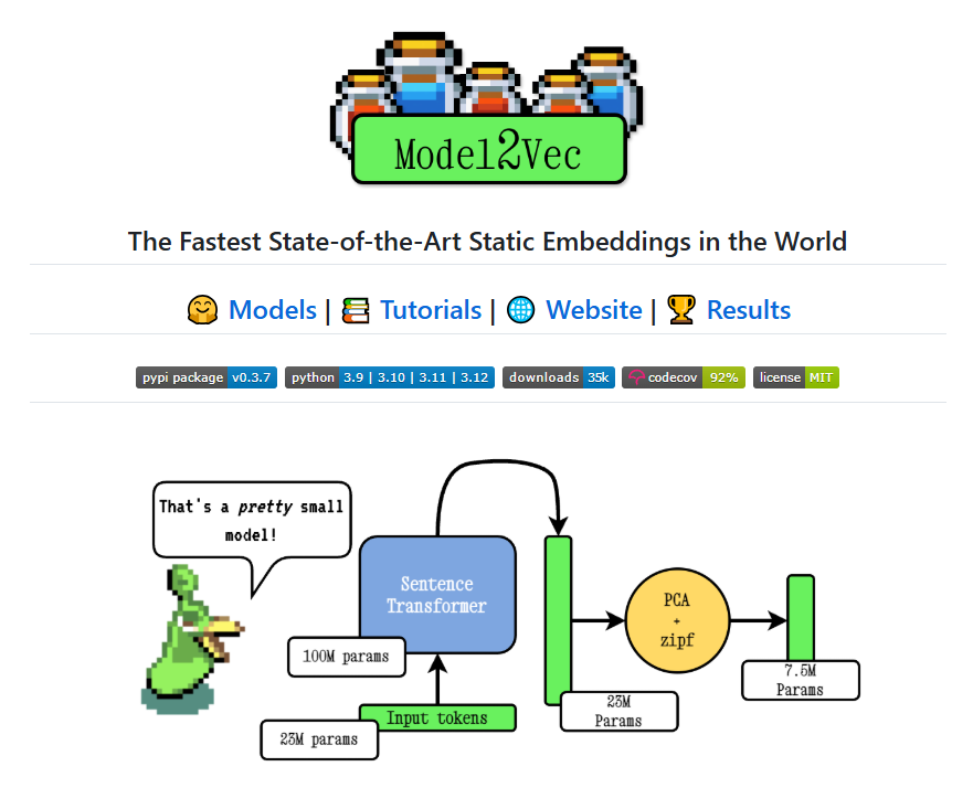 • 大幅度压缩与加速:Model2Vec 将嵌入模型的体积缩小 15 倍,同时速度提升 500 倍,使得 RAG 在执行时的计算开销大大降低,特别适合在需要快速响应的大规模应用场景中使用。