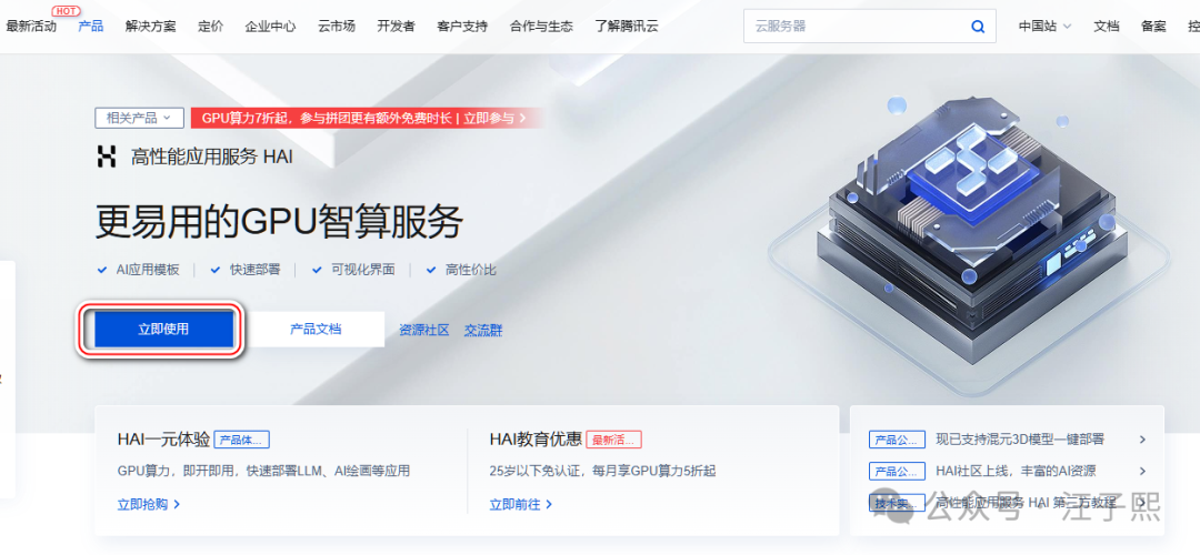 腾讯 HAI,全称 Hyper Application Inventor,高性能应用服务,是一款面向 AI 、科学计算 的 GPU 应用服务产品,提供即插即用的澎湃算力与常见环境。