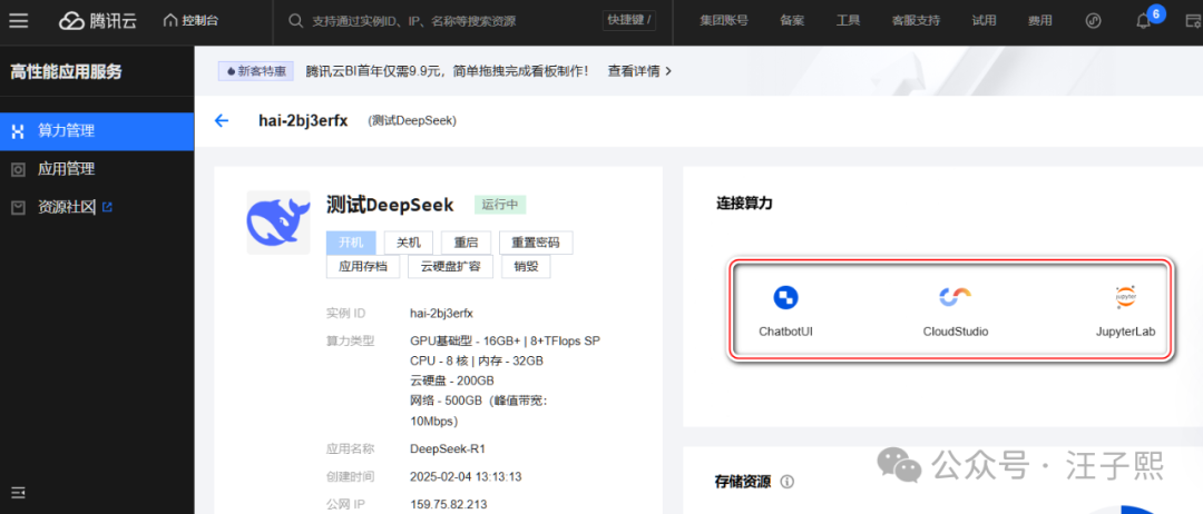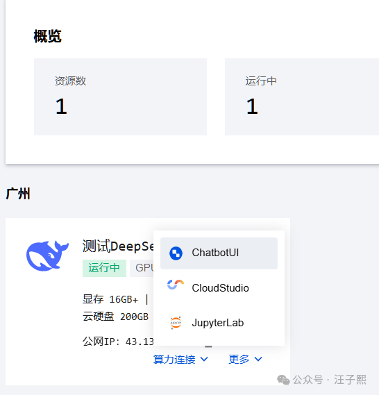 创建好的实例中,预置了分别以 Web 浏览器方式和终端命令行方式访问 DeepSeek R1 模型的 「ChatbotUI」和「JupyterLab」.