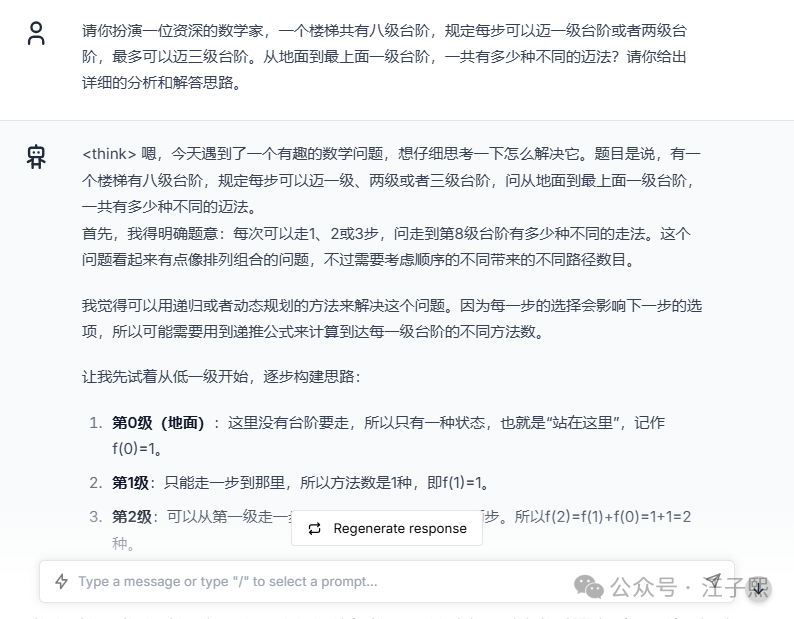 请你扮演一位资深的数学家,一个楼梯共有八级台阶,规定每步可以迈一级台阶或者两级台阶,最多可以迈三级台阶。从地面到最上面一级台阶,一共有多少种不同的迈法?请你给出详细的分析和解答思路。