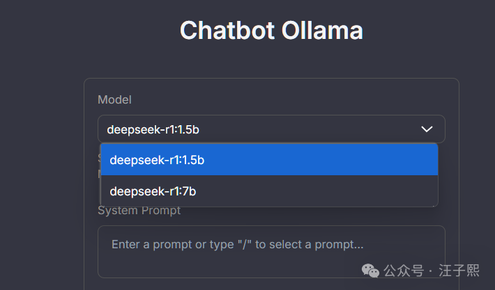Ollama Model 下拉菜单里,可以选择预置的 1.5b 或者 7b 模型。
