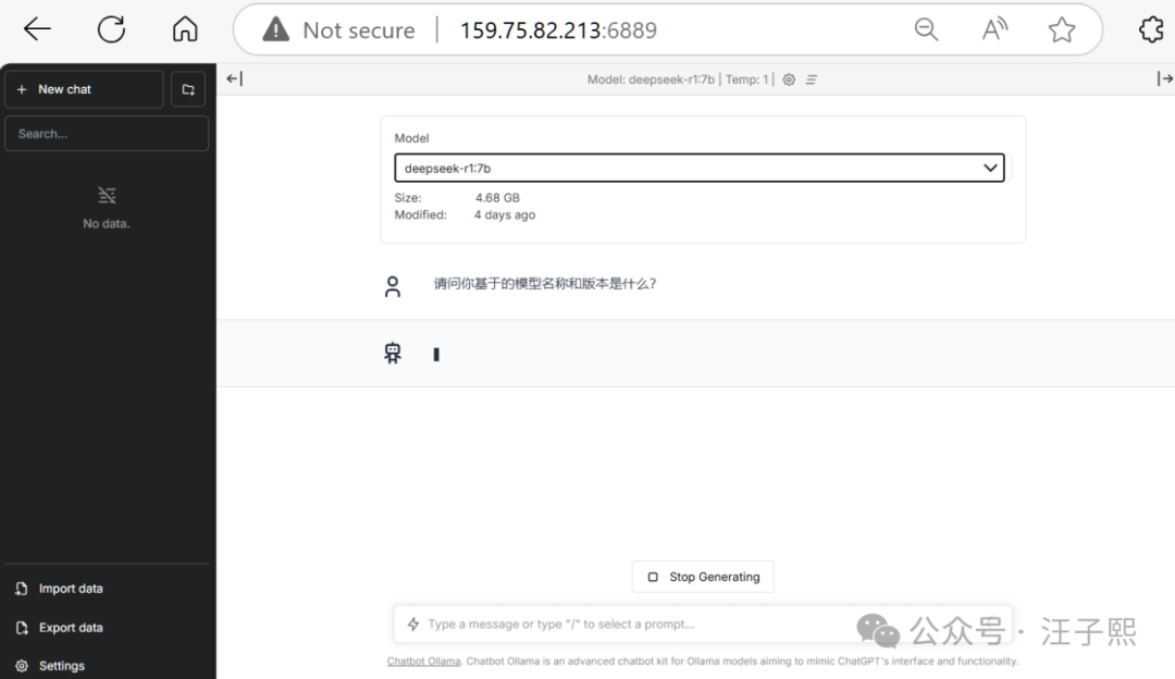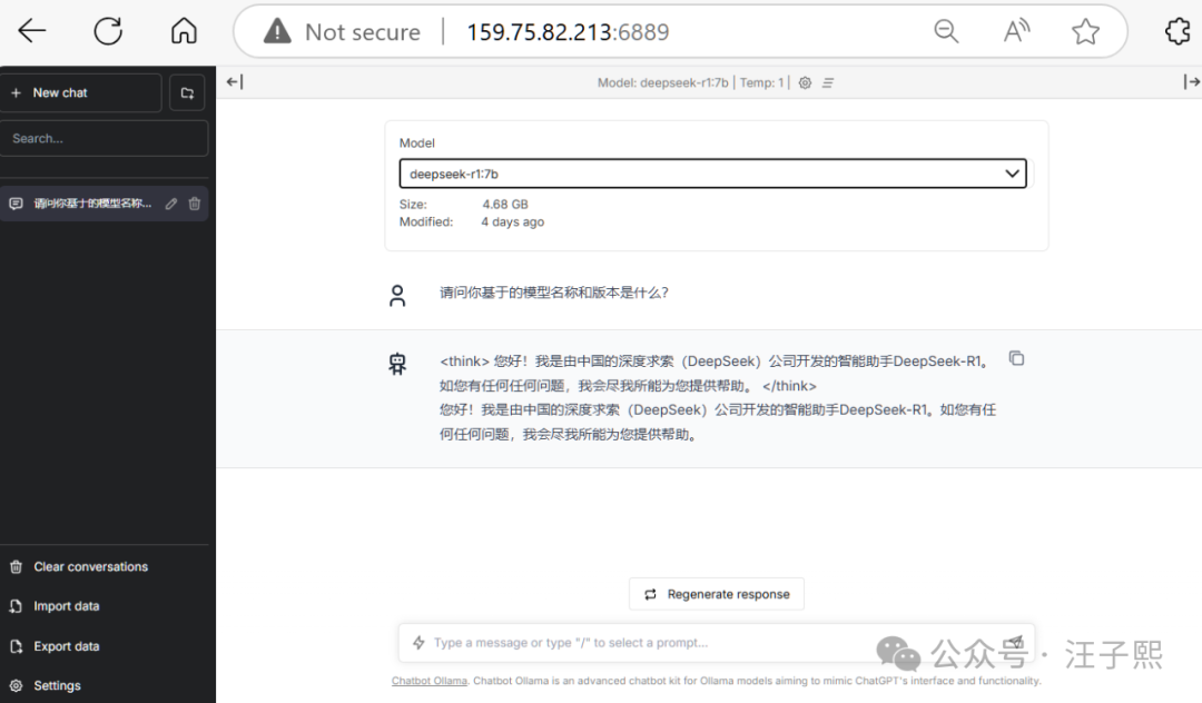点击「ChatbotUI」,会自动打开一个浏览器窗口,我们就可以在这个窗口里,同腾讯 HAI 上部署好的 DeepSeek 进行交谈了。