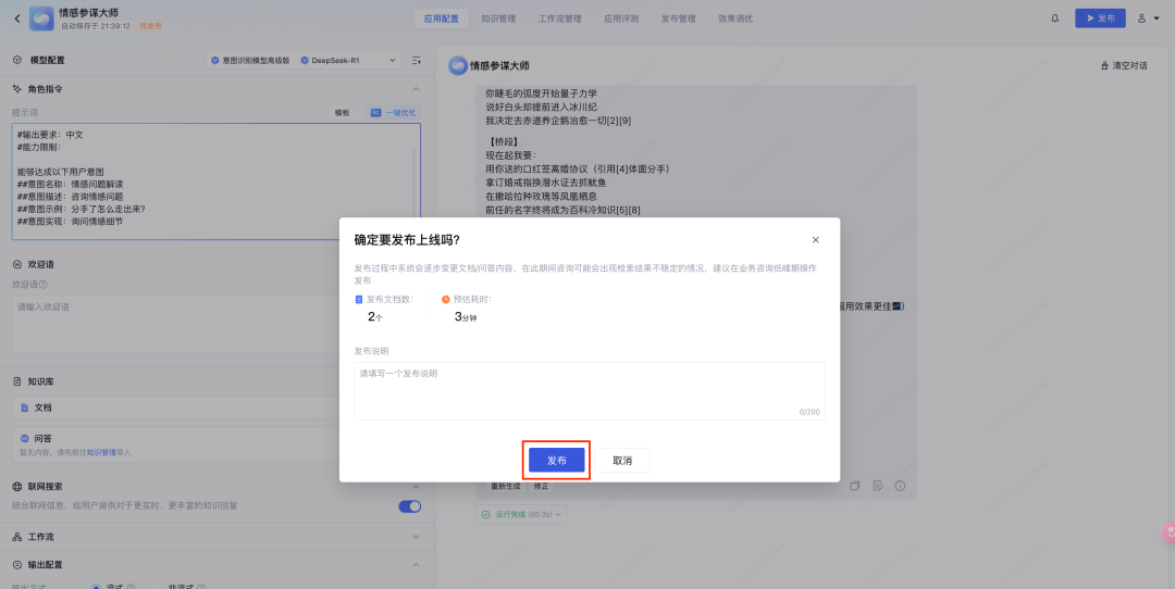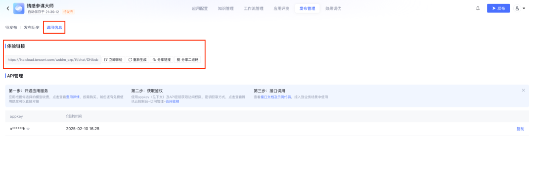 调节好配置,点击发布后,我们可以到发布管理-调用信息-查看体验链接、分享体验链接。也可查看 API key,使用 接口调用 的方式,接入到业务场景中。