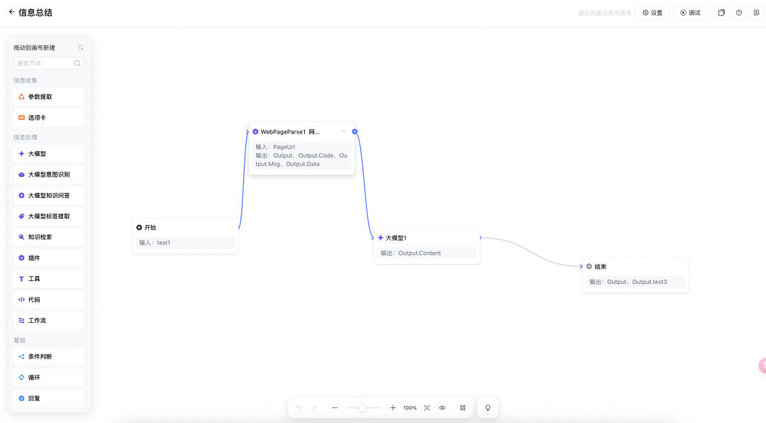 而且高阶玩家还可以自己搭建工作流,我只花了几步就搭建了一个读取网页信息并总结要点的简答工作流,大家可以去尝试一下。