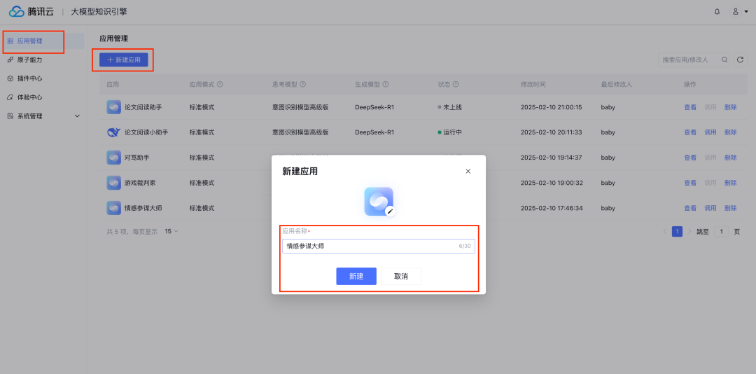 登陆后,点击左侧的应用管理,然后点击新建应用,就可以给自己的 Agent 命个名。