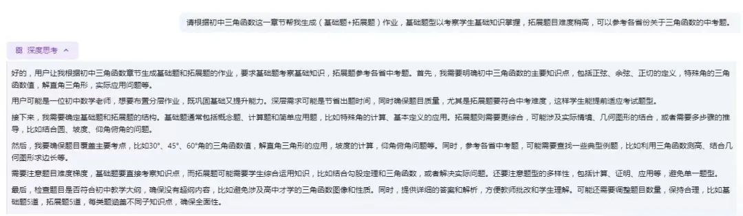 教师输入知识点(如"三角函数公式应用")、难度等级(初中/高中)和题型要求,DeepSeek自动生成10道配套练习题,支持导出Word或PDF格式。
