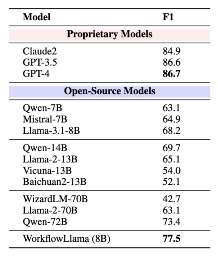 实验结果表明,在 CodeBLEU 和 Pass Rate 指标上,WorkflowLlama 都取得了 SOTA 的成绩,远超其他模型,包括 GPT-4o 和 Llama-3.1-70B 等大参数的模型。