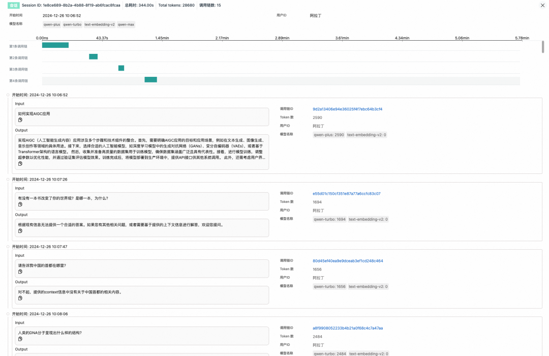 • 会话分析视图:可以有效了解用户对话时序以及对话问答效果,帮忙开发者优化流程设计以及提示词调优,从可观测到业务运营实现更好的业务洞察。