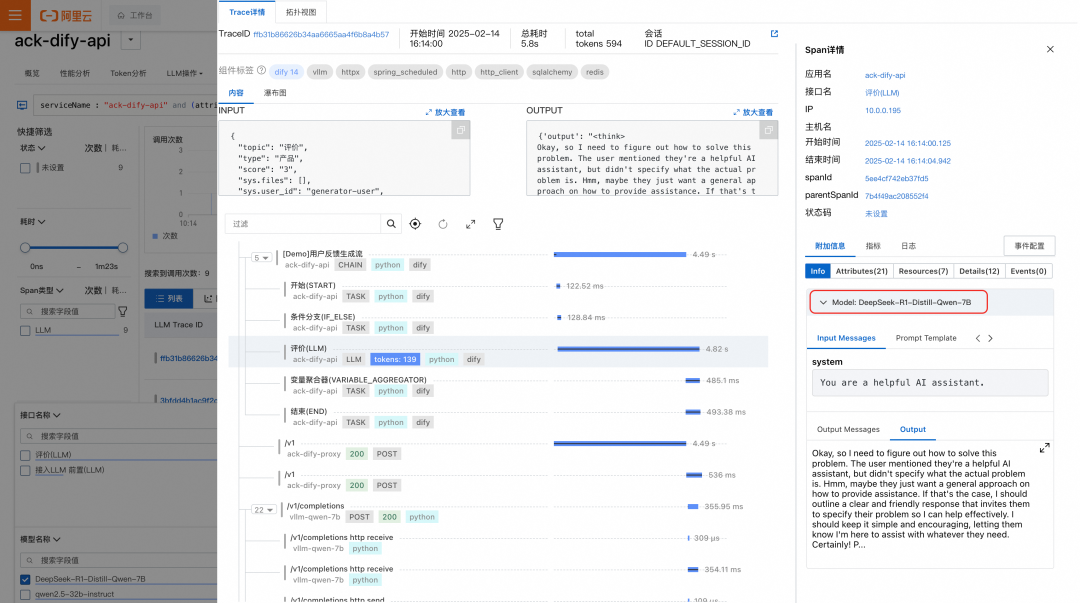 步骤三:在 Dify 应用入口发起流量,登录应用实时监控服务 ARMS 工作台,查看调用链详情效果如下,包含模型调用参数、Token 消耗、调用耗时以及输入输出等内容: