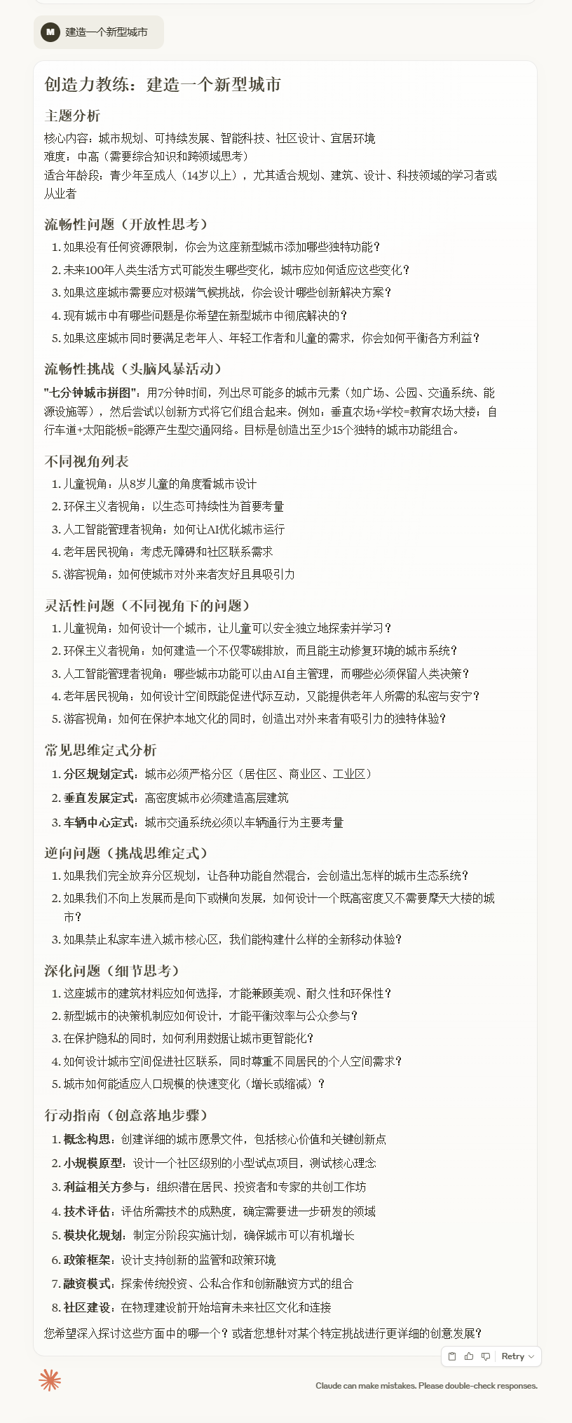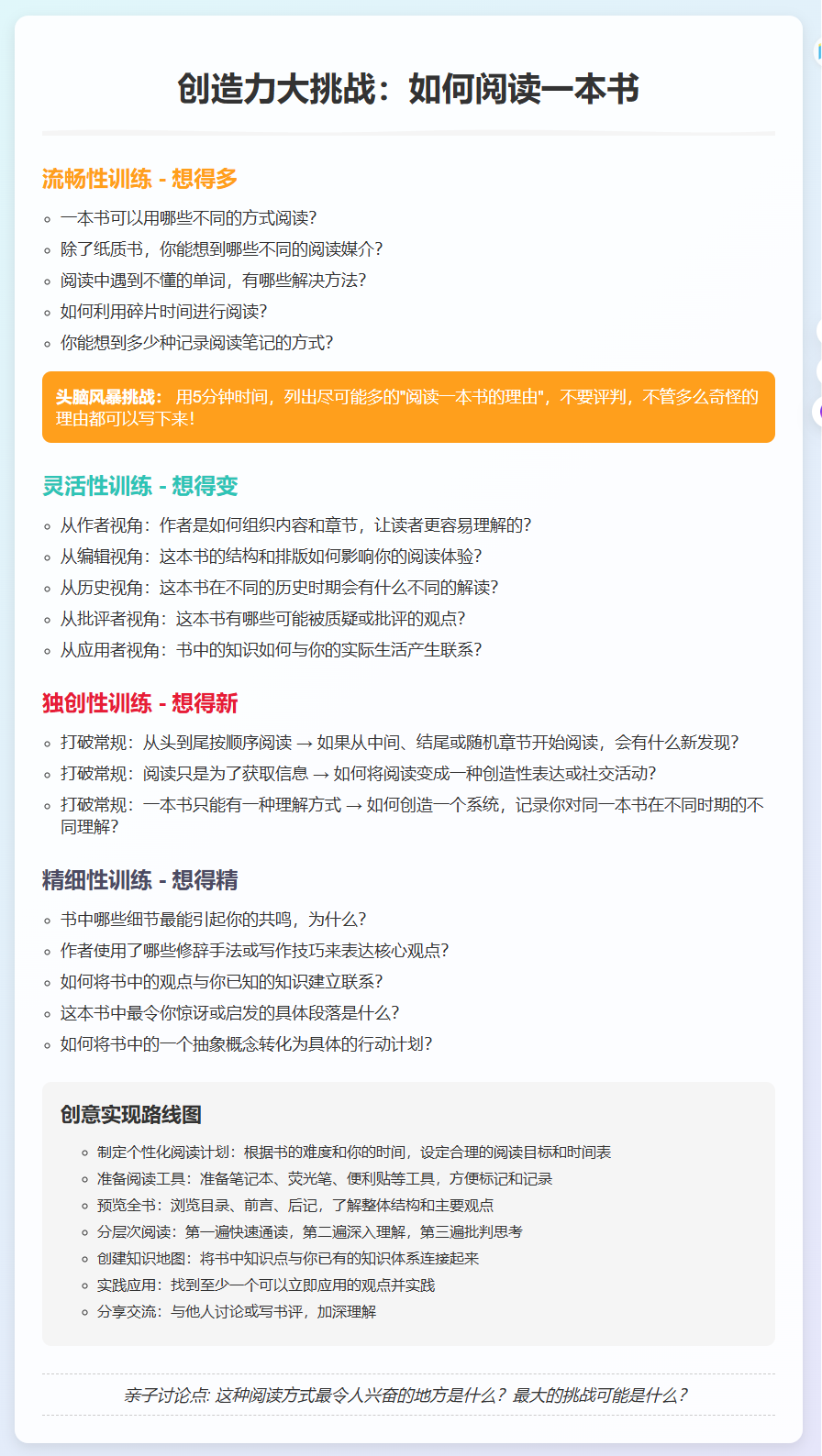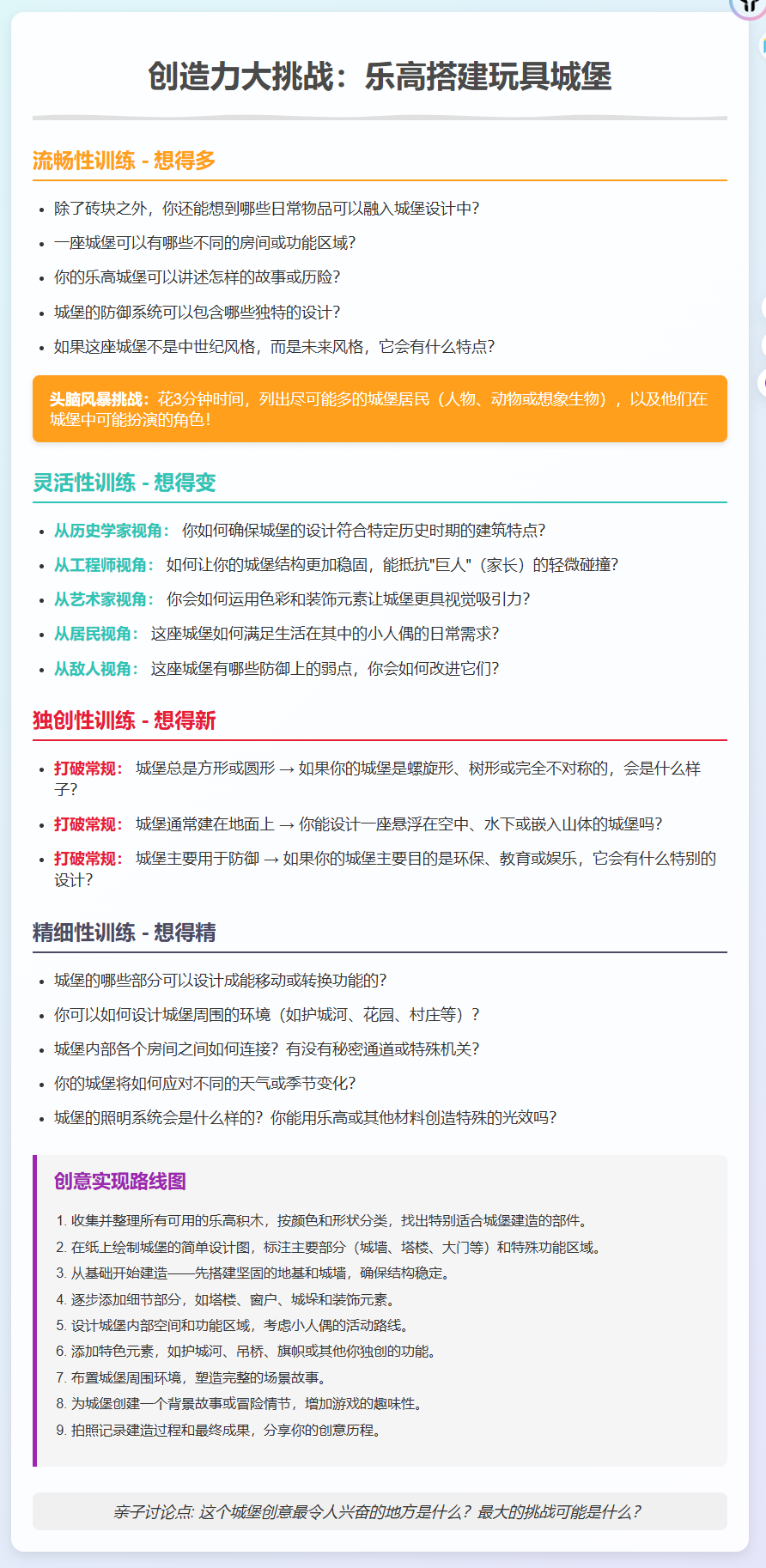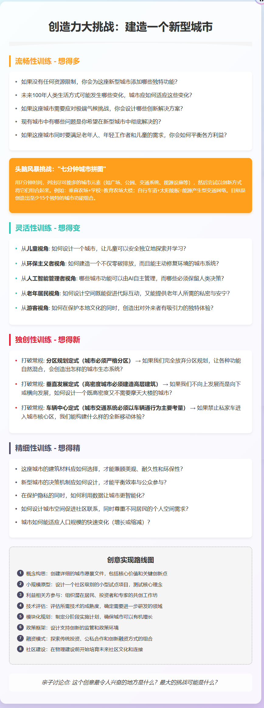 在 AI 时代,培养创造力不仅仅是为了应对未知的未来,更是为了让孩子保持对世界的好奇心和探索欲。通过这种系统化的创造力培养方法,我们可以帮助孩子在信息爆炸的时代中保持独立思考的能力,成为真正的创新者而非知识的搬运工。