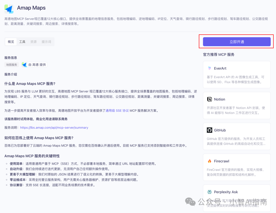 https://bailian.console.aliyun.com/?tab=mcp#/mcp-market的 MCP 市场,找到高德的 MCP 服务,点击立即开通