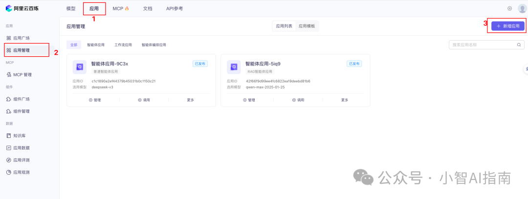 创建一个应用来调用高德的 MCP 服务,切到应用 Tab 的应用管理部分,点击右上角「新增应用」按钮,推荐选智能体应用