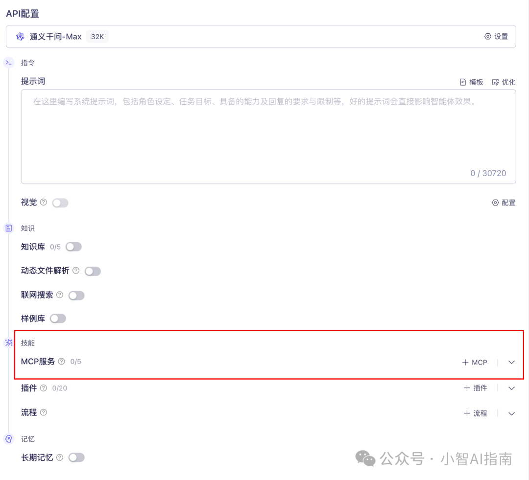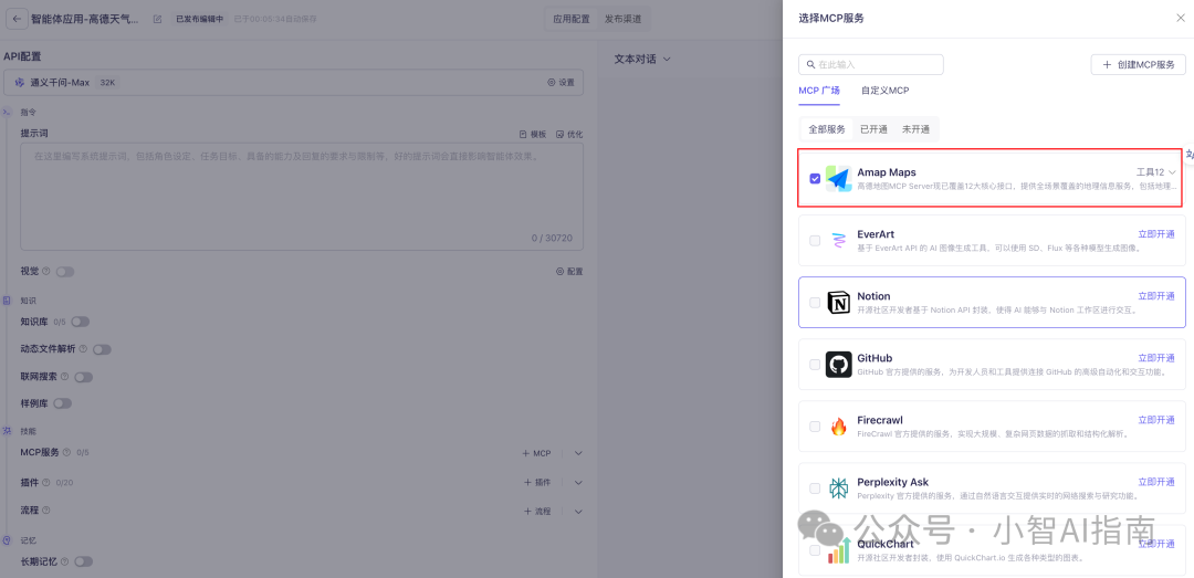 在智能体中添加高德天气 MCP 服务,在侧边栏勾选你刚才开通的高德 MCP