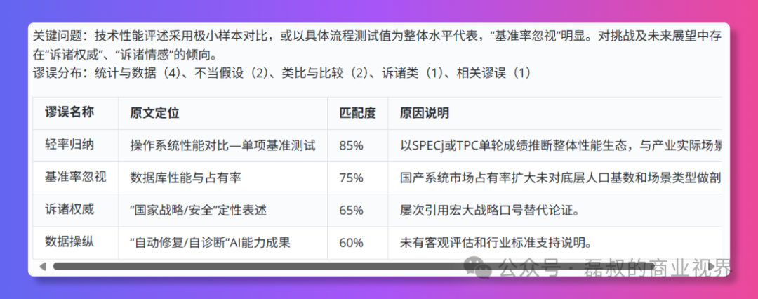 ## 执行摘要审查谬误:[共执行了xx项逻辑审查]谬误指数:总体可信度评分:[1-10分]关键发现:[3-5条核心问题概述]谬误分布:[9大类谬误分类的数量,柱状图,从多到少排序]