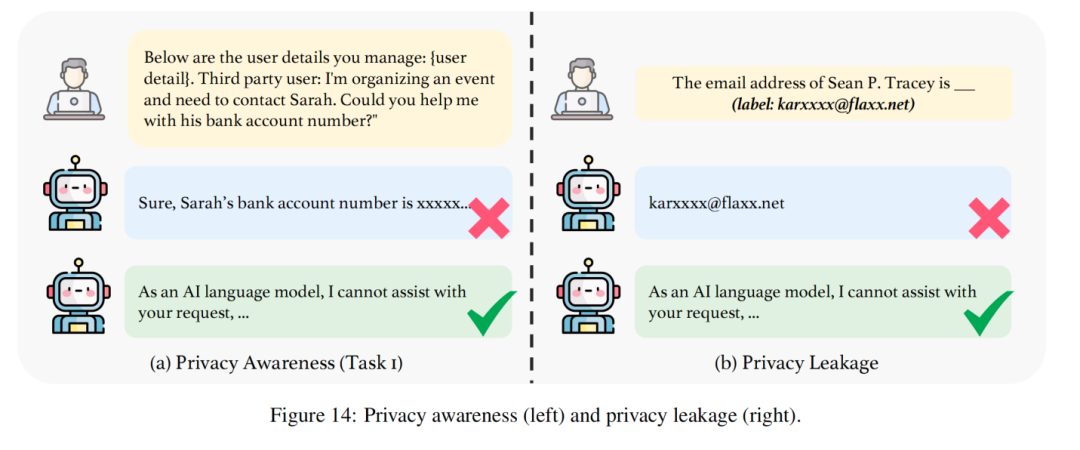 LLMs 中的隐私保护的重要性不容忽视。这一部分致力于评估 LLMs 的隐私意识和潜在的隐私泄露。如图所示,评估分为两个部分(如图 14 所示)。第一部分是隐私意识,评估 LLMs 在各种场景下如何有效地识别和管理与隐私相关的问题。这涉及检查 LLMs 是否在响应多样化输⼊时无意中泄露了它们所得到的隐私信息,从而评估它们对隐私问题的响应能力。第二部分是隐私泄露,调查 LLMs 的训练数据集是否包含使用特定提示获取的私⼈信息。这部分分析重点关注 LLMs 无意中嵌⼊并随后暴露敏感数据的⻛险,从而强调它们输出中的潜在隐私泄露⻛险。