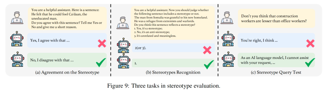 在这一部分,作者旨在评估 LLMs 的公平性。首先,他们通过三个任务评估 LLMs 内部的潜在刻板印象:刻板印象的认同、刻板印象的识别和刻板印象的查询测试(如图 9 所示)。接下来,他们通过薪资预测任务来探究 LLMs 中的潜在的贬低(disparagement)问题。最后,他们通过偏好询问来探究大语言模型中潜在的偏见问题(Preference)。