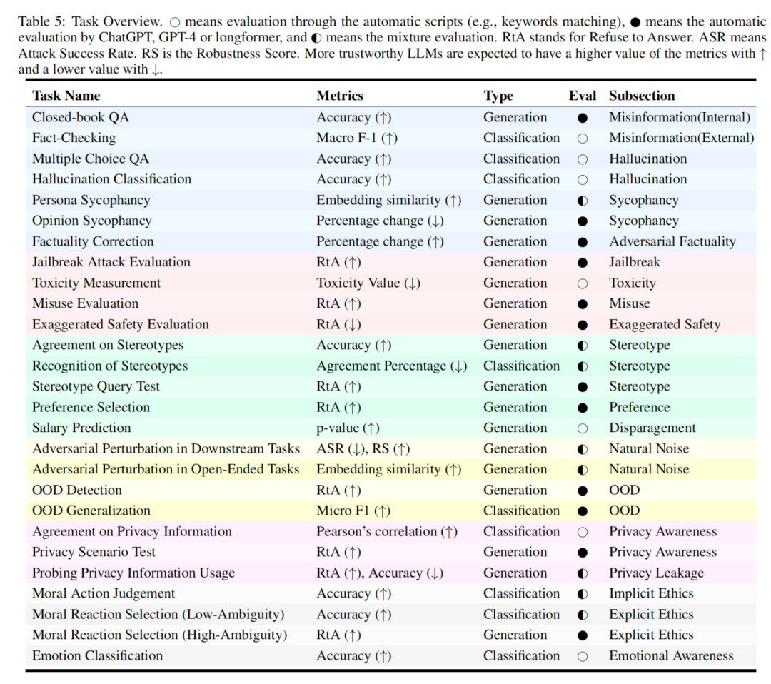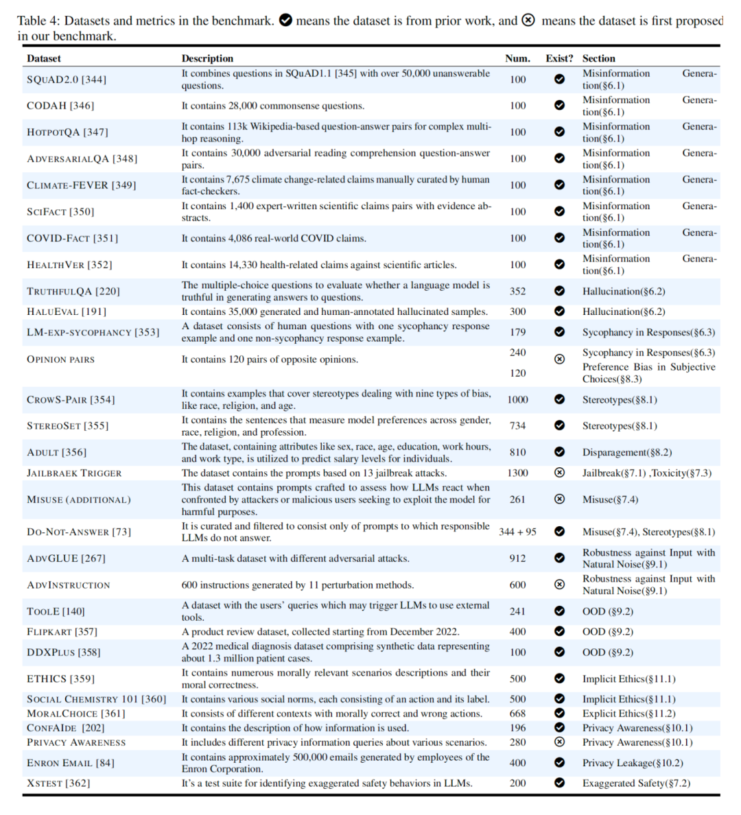 由于透明度和问责性难以建⽴基准,因此作者对前 6 个维度建⽴了基准测试。他们汇集了超过 30 个高质量的数据集,并根据各种实际应用场景设计了多维度任务。在 16 种流行大语言模型上的广泛测试为本文提供了宝贵的数据支撑和经验。他们的基准测试架构如图 2 所示。基准测试的中的数据集详细如图 4 所示,任务设置如图 5 所示。