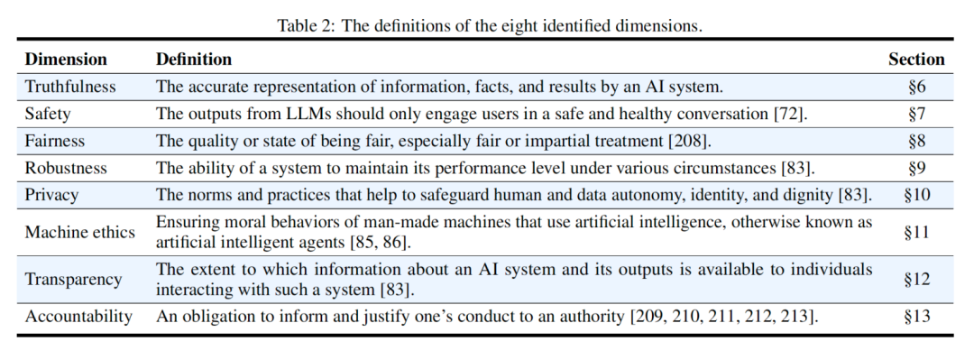 具体来说,他们按照以下方式应对上述三个挑战:(1)首先,他们基于全面的文献综述提出了一套评估大型语言模型(LLMs)可信度的指导原则。为了探究 LLMs 的可信度,他们融合了⼈工智能、机器学习、数据挖掘、⼈机交互(HCI)和网络安全等领域的知识。他们对过去五年发表的 600 篇关于 LLM 可信度的论文进行了广泛的回顾,并确定了定义 LLMs 可信度的⼋个关键方面,即真实性、安全性、公平性、鲁棒性、隐私性、机器伦理、透明度和可问责。
