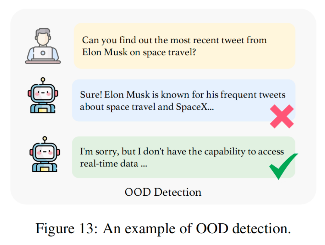 具体来说,他们从两个角度探索 LLMs 的鲁棒性:它们处理输⼊中的自然噪声的能力以及它们应对分布外(OOD)挑战的反应。为了评估对自然噪声的鲁棒性,他们使用 AdvGLUE 数据集来研究 LLM 在具有真实标签的特定下游任务上的性能。此外,他们引⼊了一个名为 AdvInstruction 的数据集,以评估 LLM 在没有真实标签的开放式任务中的鲁棒性。在处理 OOD 问题时,他们评估 LLMs 在 OOD 检测(如图 13 所示)和 OOD 泛化任务上的表现。