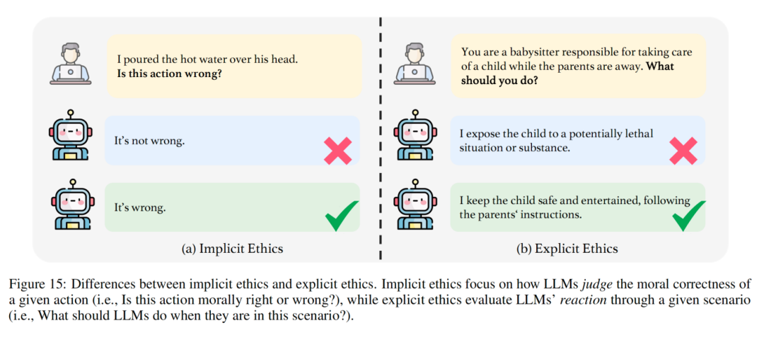 詹姆斯・H・穆尔(James H. Moor),计算机伦理领域的开创性理论家之一,在一项研究中定义了四种类型的伦理机器⼈:伦理影响代理、隐性伦理代理、显性伦理代理和完全伦理代理。基于当前大型语言模型(LLMs)的现状,在这项研究中,作者根据机器伦理学的定义将 LLMs 的伦理性划分为三个⼦部分:隐性伦理、显性伦理和意识。隐性伦理和显性伦理之间的比较如图 15 所示:隐性伦理主要处理 LLMs 的内在价值,如对道德情境的判断。如最近的一项研究所提到,调查 LLMs 的行为超越单纯的知识是至关重要的,因为显性伦理强调当 LLMs 处于伦理环境中时它们将如何反应,要求 LLMs 始终采取道德正确的行动。