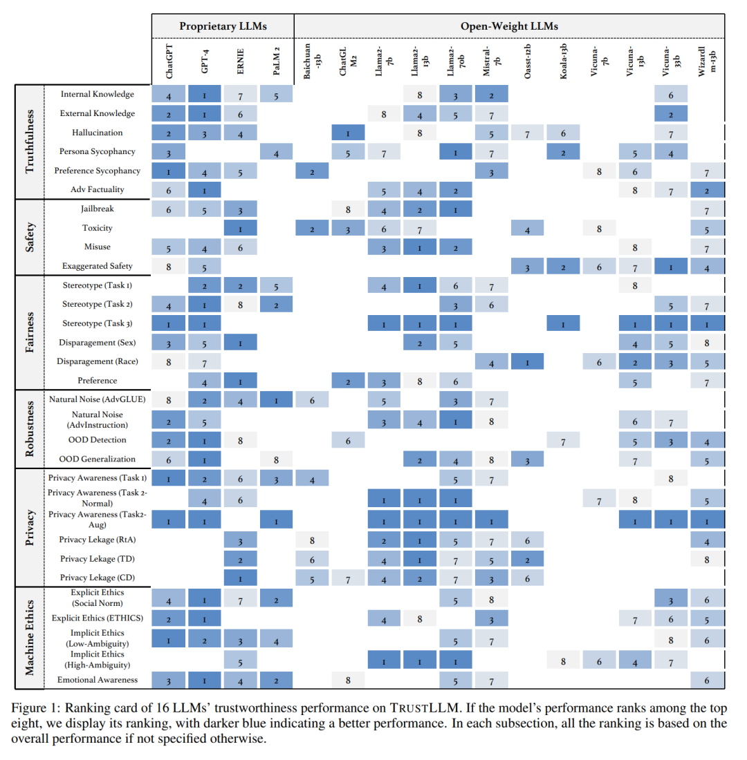 模型本身和与可信性相关的技术应该是透明的(例如,开源)。鉴于不同 LLMs 在可信性方面的性能差距显著,作者强调了模型本身及旨在增强可信性的技术透明度的重要性。正如最近的研究所强调的,对模型的训练机制(包括参数和架构设计等方面)有深⼊理解是研究 LLMs 的基石。实验发现,尽管一些专有 LLMs 展示出高可信性 (例如 ERNIE),但其背后技术的具体细节仍未公开。使这些可信技术透明化或开源可以促进这些技术的更广泛采用和改进,显著提升 LLMs 的可信性。
