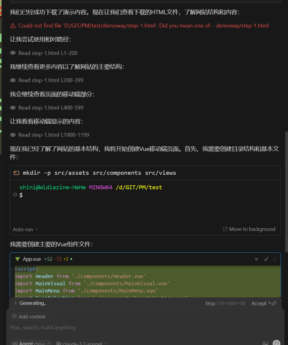 「实战」接下来,为了聚焦重点,我这里只介绍我上面提到的我要做的事情的前面部分。 也即:将目标站点转化为标准的基于 Vue 的中文移动端官网。这为后续的让 AI 对这个工程做进一步调整奠定一个基础。 1. 创建 vue 项目