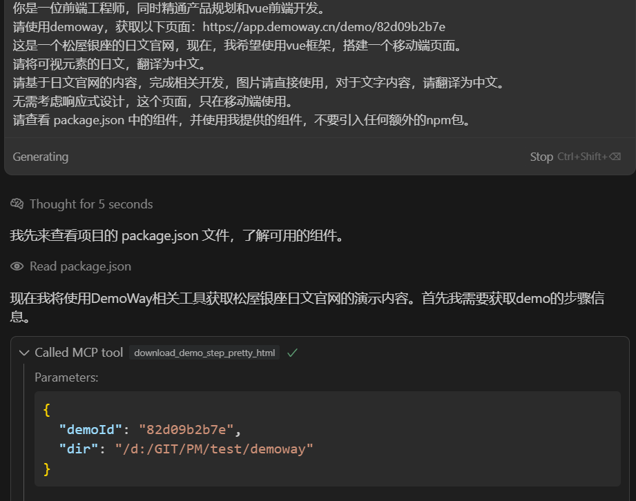 3. 录制相关页面本例,是采集一个日本官网,并制作国内用户的 H5 https://www.matsuya.com/ginza/ 录制页面的过程这里就不赘述了,DemoWay MCP Server 官方文档有详细介绍:https://demoway.cn/docs/ai-proto/mcp/capture 4. 在 Cursor 里基于这些页面生成相关 Vue 代码录制完成后,会得到一个示例 Prompt,其实这个 Prompt 不重要,我这里是自己重新写的。但里面最关键的是有一个网址,类似这样的:https://app.demoway.cn/demo/bf262f604b , 这个需要在你的 Prompt 里保留,否则 AI 无法调用 DemoWay MCP Server 来获取页面内容。 因为当前使用的是 claude3.7 上下文不够,所以我们不应该一次性完成多个任务,因此我们简化了上例中 i18n 的需求,只要求 AI 改成中文移动端官网就好。 简化后: