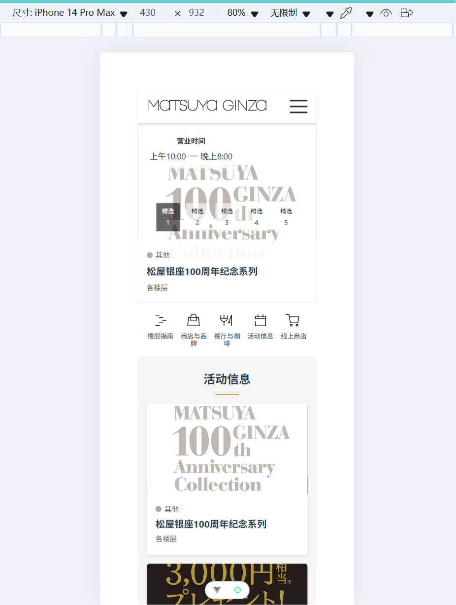 1. 顶部导航栏(Header):显示松屋银座的 logo 和菜单按钮,点击菜单按钮可以打开完整导航2. 主视觉区域(MainVisual):轮播图展示,包含了松屋银座 100 周年纪念系列等特色活动3. 主菜单(MainMenu):提供快速访问的图标菜单,包括楼层指南、商店品牌、餐厅咖啡等4. 活动信息区域(EventsSection):展示最新的活动和展览信息5. 新闻公告区域(NewsSection):展示商场的最新公告和新闻6. 页脚(Footer):包含联系方式、导航链接、社交媒体链接和版权信息