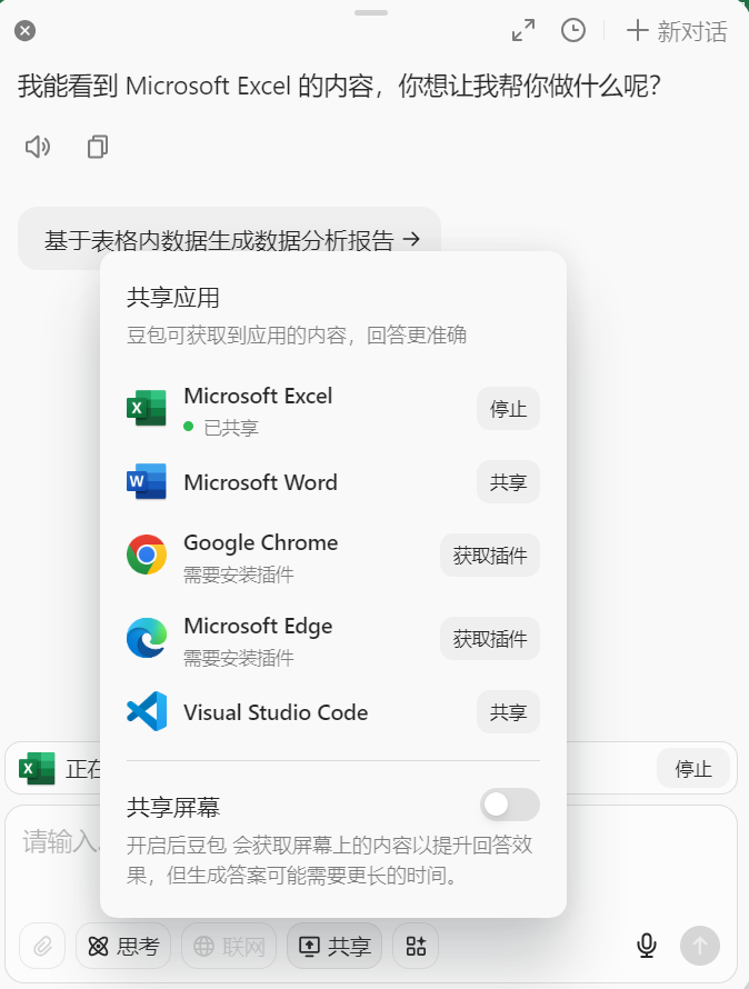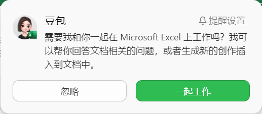 前两天的版本更新增加了接入其他应用(如Excel)的功能。打开这些应用时,豆包会询问是否要一起工作,可以直接就应用中的内容向豆包提问,也可将豆包的输出直接复制入该应用。