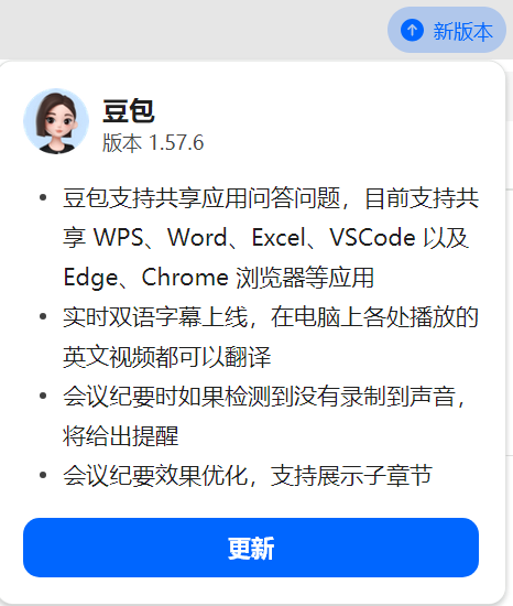 首先,豆包应用的形态更丰富,涵盖网页、浏览器插件、手机App以及桌面应用。桌面版更新频繁,每隔几天就能看到右上角蓝色的新版本提示。