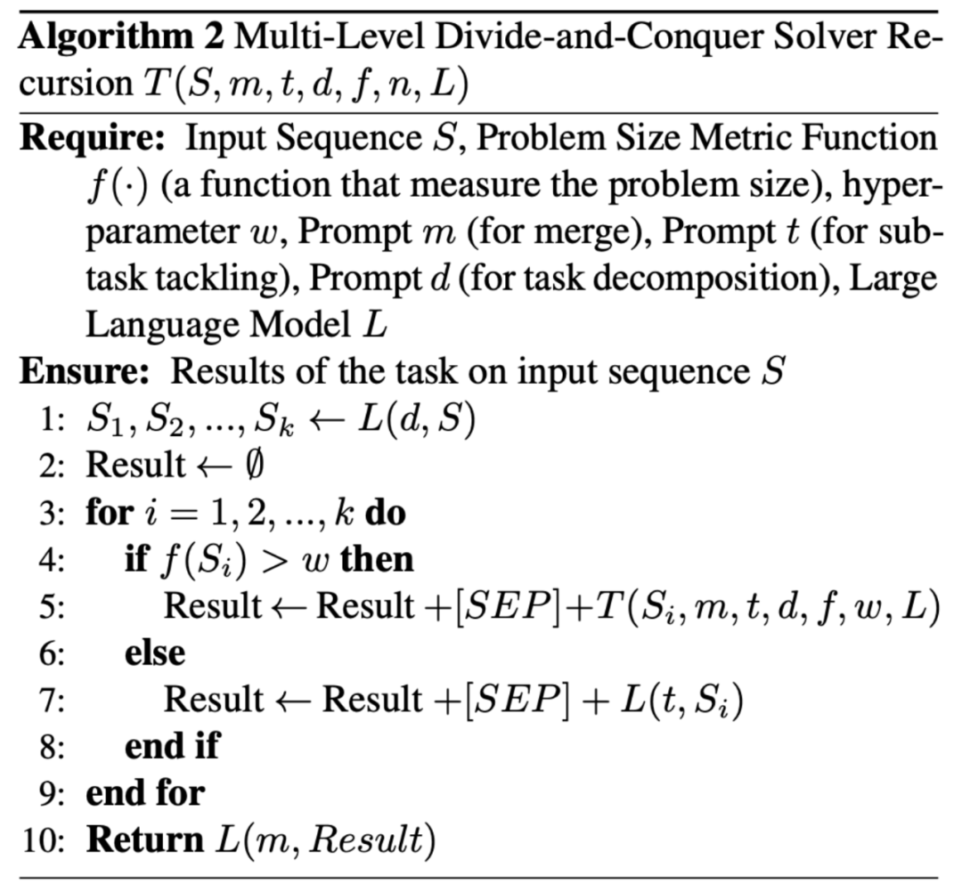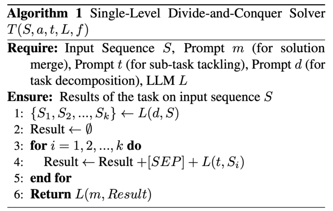 这个例子向我们展示了:对长输入进行划分可以帮助我们更好地解锁模型的能力。基于这一点,我们提出利用分治程序来引导 LLM,从而赋予模型更强的分辨力。