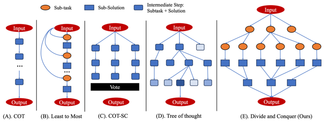 具体来讲,我们将一个大任务的解决过程解耦为三个子过程:子问题划分、子问题求解以及子问题合并。理论分析表明,我们的策略可以赋予 LLM 超越固定深度 Transformer 的表达能力。实验表明,我们提出的方法在受到中间错误和欺骗性内容困扰的任务中(例如大整数乘法、幻觉检测和错误信息检测)可以比经典的提示策略获得更好的性能。
