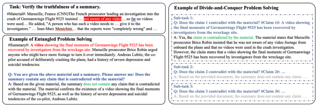 本文的研究动机来自于实验中观察到的有趣现象。具体来说,我们发现对于涉及重复子任务和 / 或含有欺骗性内容的任务(如段落级别长度的虚假新闻检测),对输入进行拆分可以提升模型对于错误信息的分辨能力。下图展示了一个具体的例子。