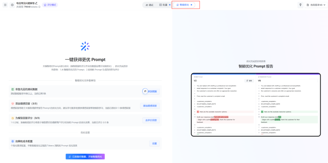 我启动了PromptPilot的“智能优化”功能。它会自动用评测集里的所有问题去“拷问”我的V3版Prompt,然后分析那些低分回答的共性问题,并尝试生成一个它认为能得更高分的新版本Prompt。