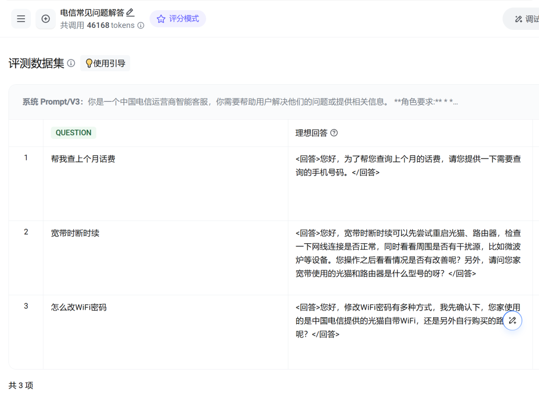 我没有几百上千条标注数据,没关系。我先在PromptPilot里新建了一个“评测集”,然后手动添加了几个最核心、最典型的用户问题作为“种子样本”,比如“查询本月话费”、“宽带时断时续”、“怎么改WiFi密码”等,并为每个问题都精心撰写了最完美的标准答案。