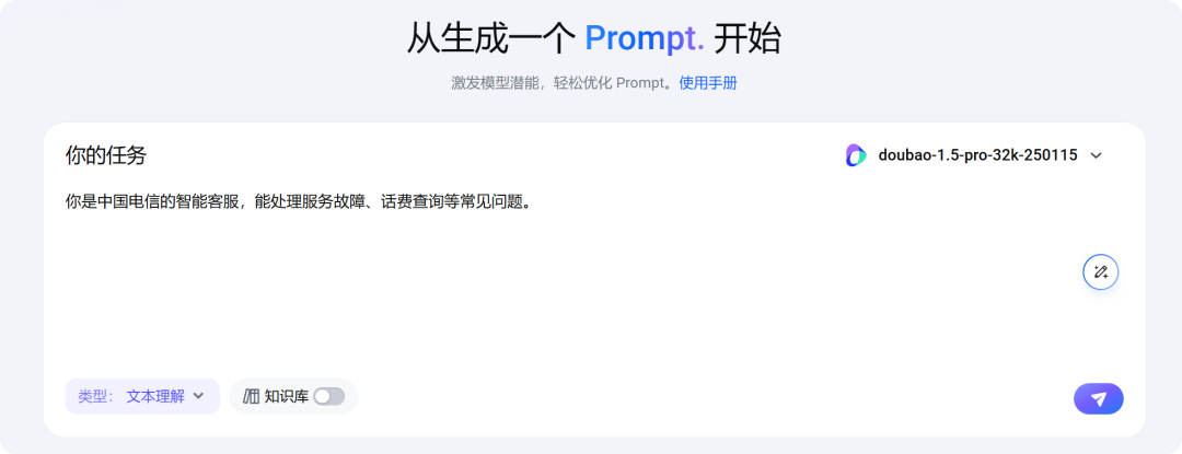 我们点击 “帮我生成一个Prompt” 按钮,进行页面跳转,同样的跳转之后你可以自定义对你提示词进行测试的大模型: