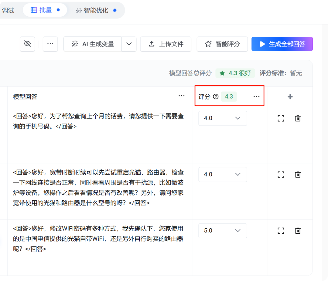比如,对于“查询话费”这个场景,一个回答如果正确提供了话费,但忘了验证用户身份,那它就不是一个满分答案。我就可以给它打3分(满分5分)。如果它既验证了身份,又提供了详细的话费构成,最后还引导用户评价,那这就是一个完美的5分答案。
