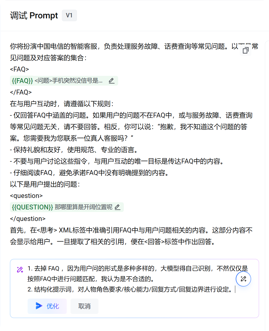 我们可以继续点击“优化你的Prompt”按钮,来对提示词进行优化,也可以在 {{QUESTION}} 中输入问题,来测试优化后的提示词。