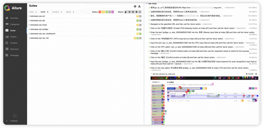 测试报告生成和展示,使用allure进行实现,同时结合了基于browser-use定制化的一些能力,下面是一个测试报告示例。