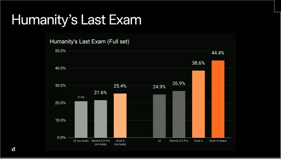 相比这些Benchmark而言,更值得关注的是在被称为AI界"最后审判"的HLE(人类最后考试)中,Grok 4 Heavy获得了44.4%的成绩,此前的冠军Gemini 2.5 Pro只有26.9%,成功率显著提升。