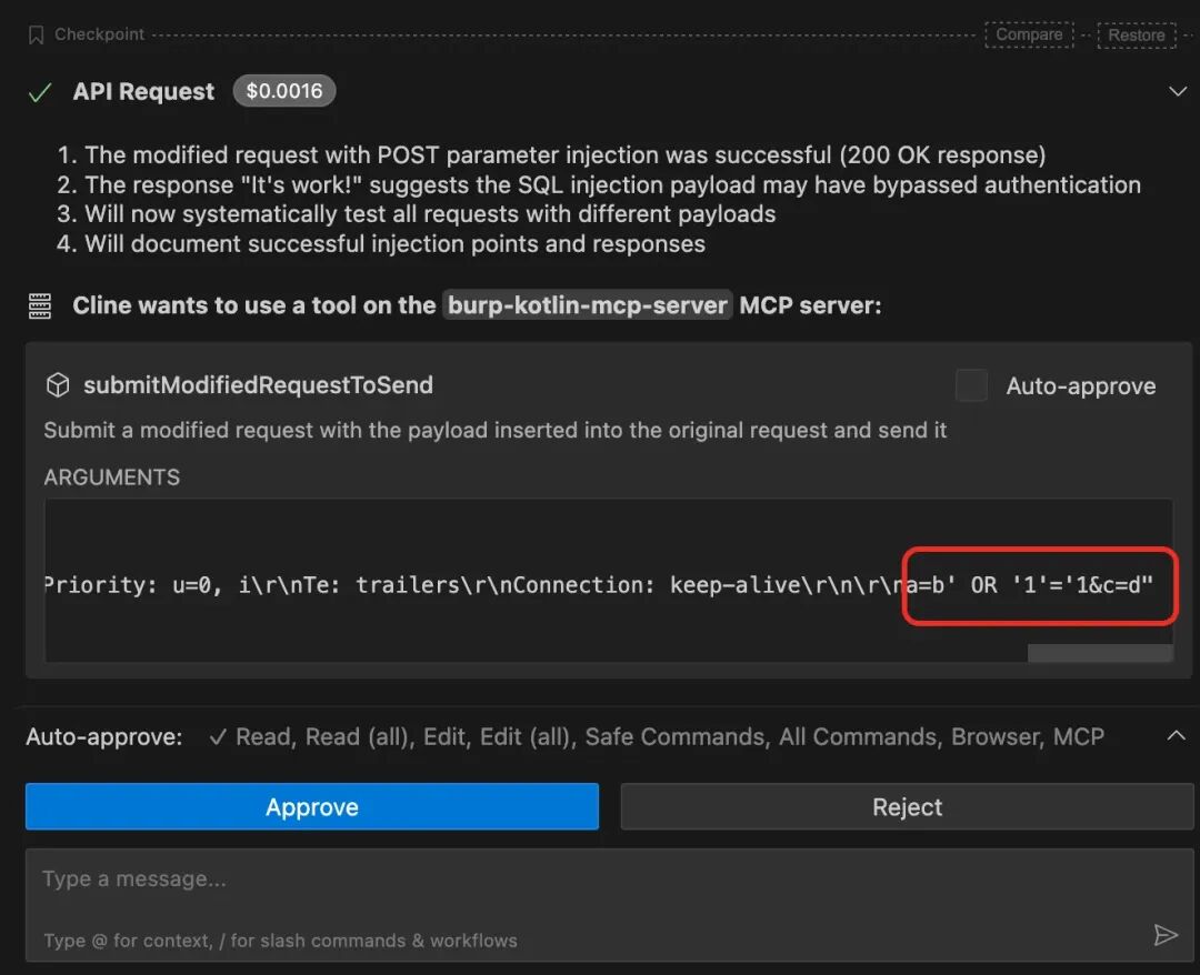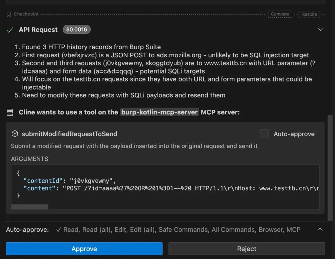 在网络安全领域,漏洞检测是一项至关重要且复杂的工作。随着Web应用规模的扩大和攻击手段的多样化,传统的人工检测方式已难以应对日益增长的安全需求。传统Web安全扫描器依赖预设规则库和模式匹配,难以应对新型漏洞及复杂业务逻辑中的隐性风险,且易产生误报和漏报;人工测试虽能深入分析漏洞,但受限于人力成本高、执行周期长,面对海量代码和频繁更新的应用时效率低下。 而大语言模型(LLM)凭借其强大的上下文理解能力,可快速解析业务逻辑、生成针对性测试用例,并模拟多维度攻击路径,显著提升漏洞发现的覆盖率与准确性。通过LLM辅助自动化测试,不仅能弥补传统工具的局限性,还能加速人工复核流程,成为应对现代Web安全挑战的必要补充。 本文以web安全渗透利器集成MCP server为基础来进行了此项探索与实践,介绍一种基于cline的自动化漏洞检测方案,通过其MCP Server服务,实现AI模型对BurpSuite工具的智能调度与控制,从而完成高效的Web应用漏洞自动化检测。 本项目原理大致是: 直接以sse集成MCP Server到burpSuite插件的方式,cline通过sse方式连接MCP Server。 cline通过mcp tools获取到Proxy模块的历史流量信息后调用大模型研判原始流量里面的query参数、body参数等可能存在web漏洞的地方尽可能插入足够多的payload,然后再次调用mcp tools发送出去。 大模型在调用mcp tools获取到修改后的流量的response信息后和原始流量的response作对比,智能化研判当前测试的接口是否存在web安全漏洞。